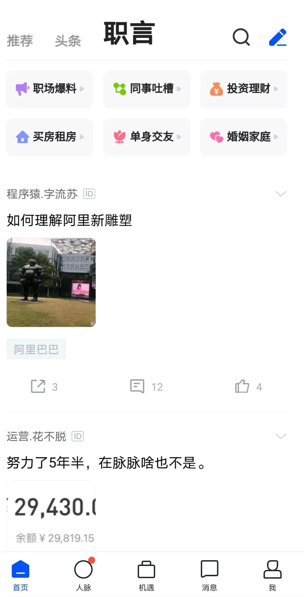 中年危机、职业瓶颈、转型破圈等打工人常见的老大难,虽然距离懵懵懂懂的新人还很遥远,但是每了解一分可能都会对大家未来的职业规划产生一丝助力,至少不会让人两眼一抹黑地踏入一个陌生的领域。职场爆料、同事吐槽、投资理财、买房租房等问题在“脉脉”的“职言”区都有讨论,新人可以在此窥见职场的真实现状,谨防踩坑。