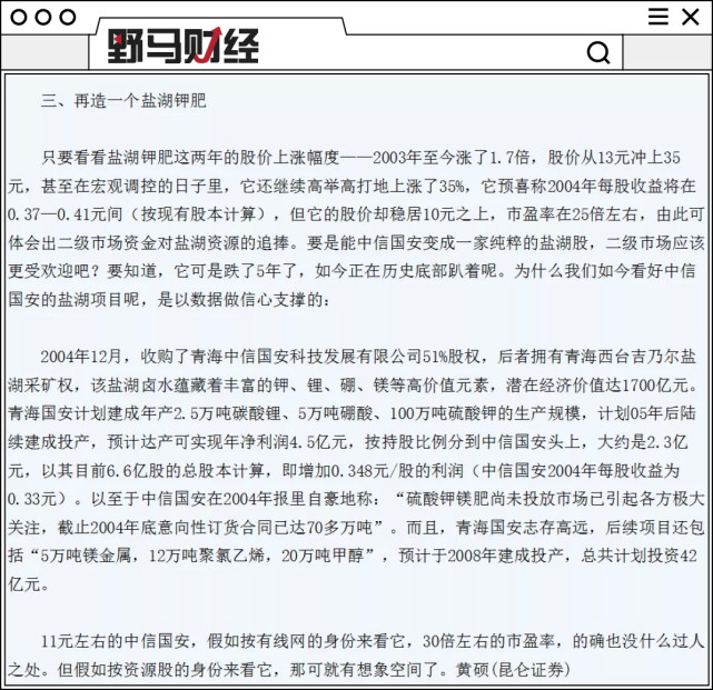 回看中信国安进军盐湖开发一事,当年曾被市场看好,比如昆仑证券研究员黄硕在《中信国安:中国有线成立后的猜想》中放言:“中信国安拥有遍布全国的客户资源:2004年底,已投资了18个有线电视项目,直接入网用户已超过500万户……假如它能继续在有线电视行业继续有所作为的话,那当然好。假如它不能继续有所作为的话,也不怕。反正它有更好的项目等着——青海西台吉乃尔盐湖,该项目投资规模宏大,正缺大资金投入呢。”