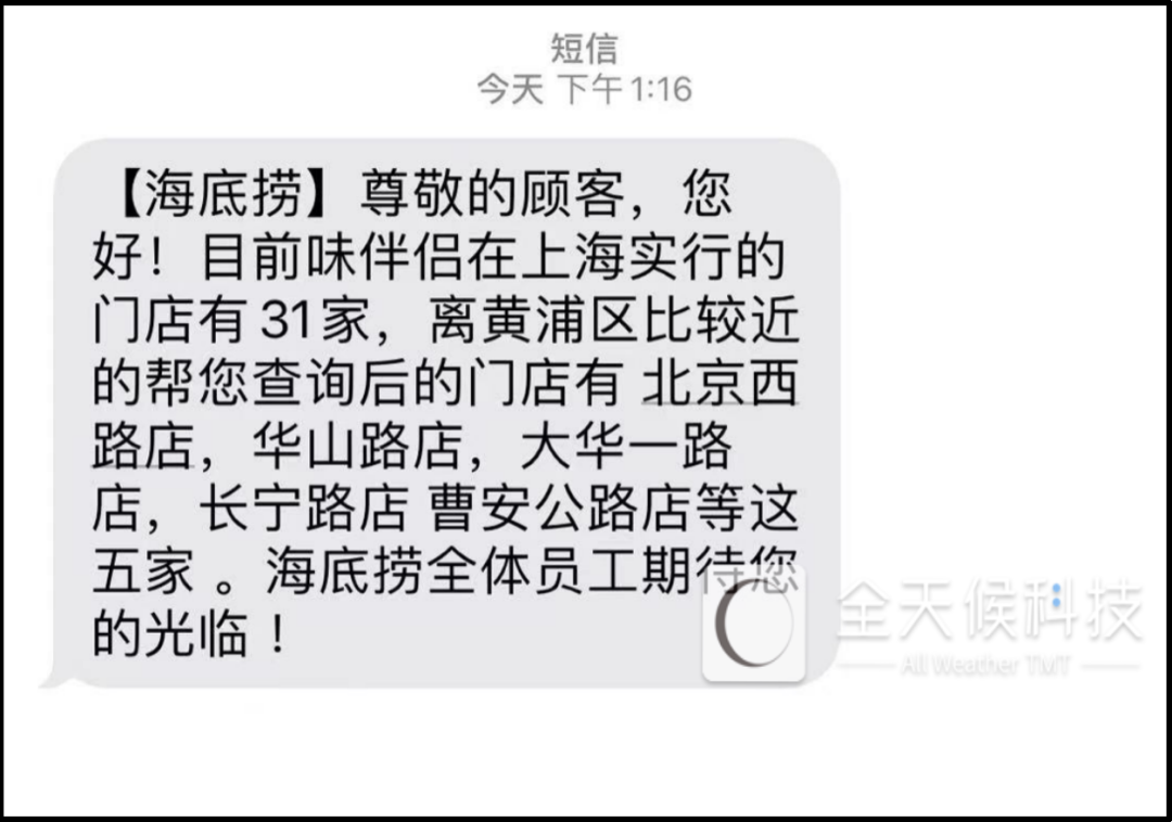 对此,全天候科技向海底捞方面求证,不过截至发稿,对方暂未对此予以回复。