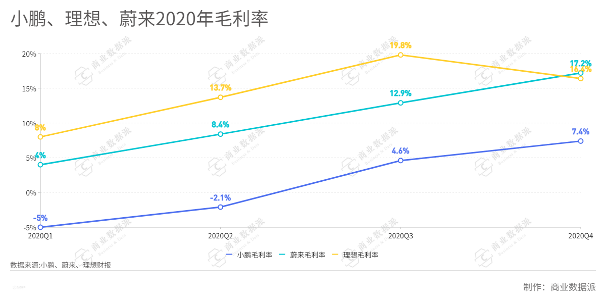 造成上述原因的有两个,第一种是小鹏汽车的销售和量产情况不及其他两家,尚未通过规模化让平均每台车的成本足够降低;第二种情况在于,由于小鹏第一款产品G3定价区间在10-20万元档,第二款产品P7定价区间在20-30万元档,均低于蔚来和理想主力车型的30-35万元价格区间,可能造车毛利率较低;两种原因综合所致,2020年小鹏汽车毛利率不及蔚来同期。