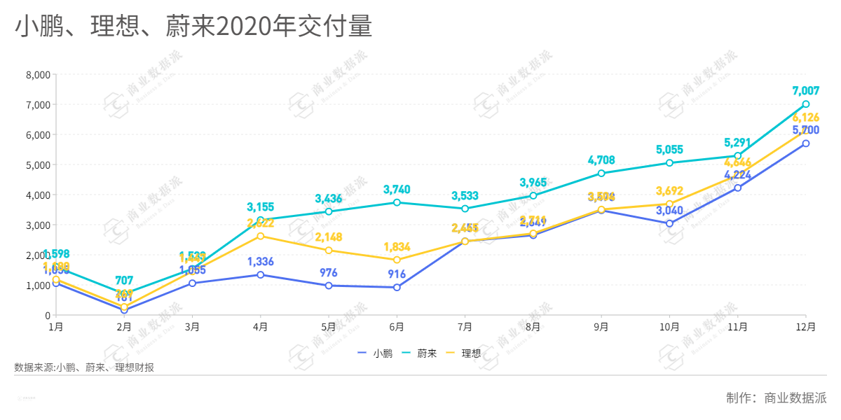 从新车交付数据来看,2020年第四季度小鹏汽车交付量达12964台,较2019年同期的3218台增长302.9%,这个增长速度看起来十分惊人。蔚来第四季度交付量为17353量,同比增长111%,理想则是在2019年12月才开始交付产品,但月交付量都在小鹏之上。
