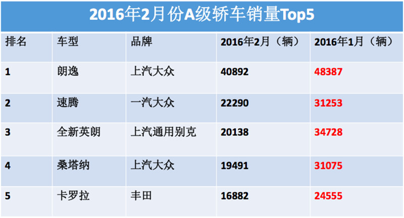 汽车市场步入缓增长新常态后,轿车市场是受影响最为明显的细分市场之一。经历去年底的回暖后,轿车市场在1月份再次出现同比下滑;而在春节因素的影响下,2月份的轿车市场的跌幅则继续扩大,达到18个百分点。其中,在占据轿车市场最大份额的A级车细分市场,同样也呈现下滑态势。但尽管如此,从单一车型的销量排行来看,合资品牌车型依旧强势,其中尤以大众系为甚。