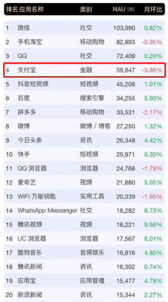 日前,大数据监测平台Trustdata公布了《2020年12月移动互联网APP排行榜》,月活跃用户数量排名数据显示,支付宝以6.145亿月活跃用户数排名第四,月环比下降了3.88%。虽然月活跃用户数要高于抖音、百度、拼多多和微博等应用,但远低于微信、手机淘宝和QQ。