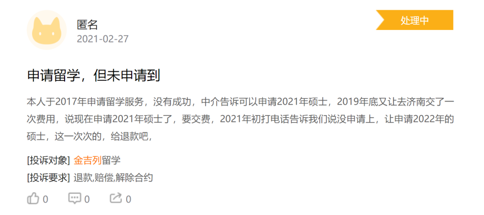 “诚信企业”光环加身,却依然面临着有增无减的投诉量。看起来有先行赔付计划,在疫情下的2020年,却是“一年仅一起”的解决速度。金吉列留学理应更爱惜“老牌行业龙头”这身羽毛。