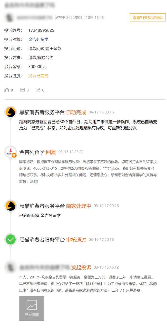 而截止目前,在上述30起投诉中,仅有发布于2020年3月10日的一则投诉已处理完成。而这起投诉是集体投诉,涉及金额高达30万元。金吉列留学于投诉发布3天后给予回复称,消费者可以拨打投诉电话或将情况反馈至邮箱,并表示将由相关负责人核实处理。