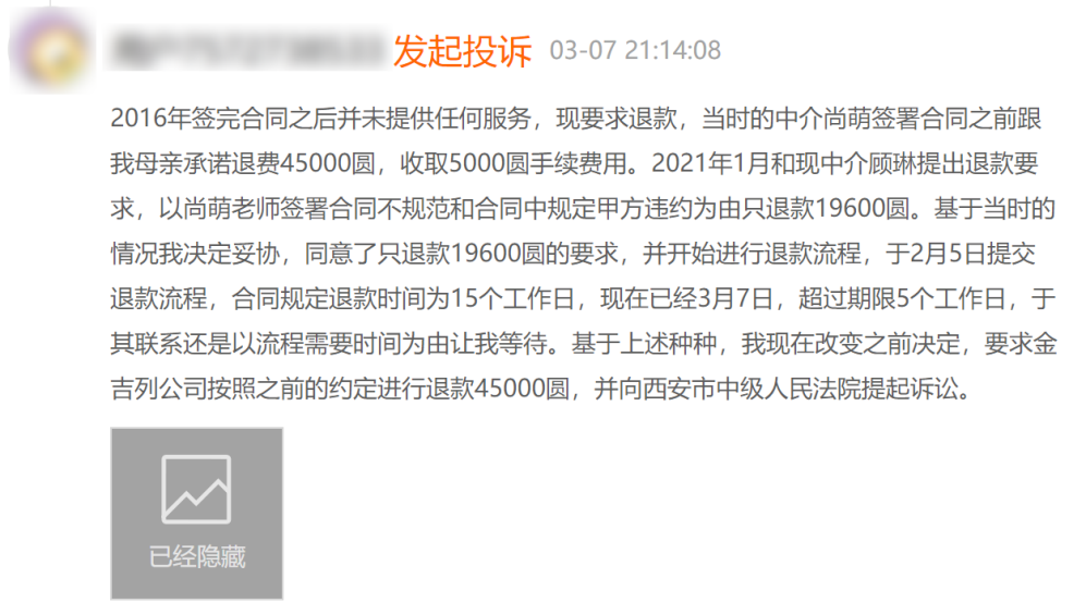 今年3月7日,有用户在黑猫投诉平台上投诉称,金吉列西安分公司在其于2016年签完合同之后,并未提供任何服务。