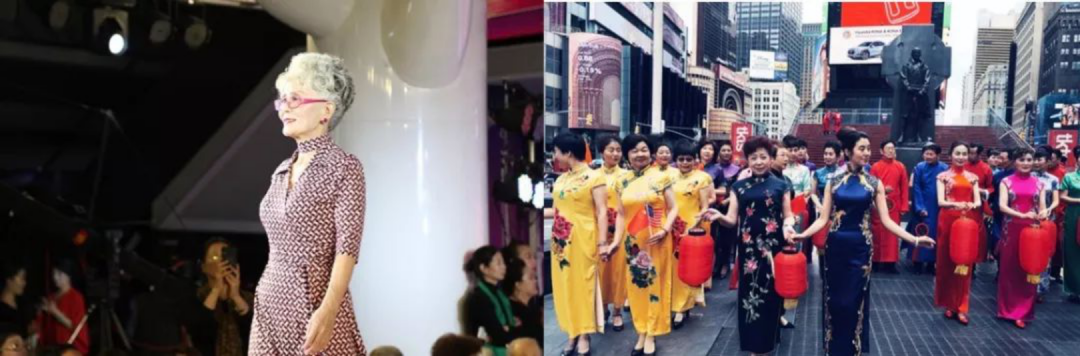 (左)北京中老年时装周;(右)退休俱乐部在纽约时代广场上演老年旗袍秀