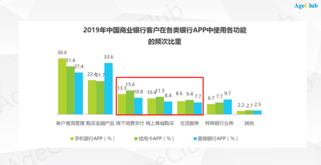 此前AgeClub咨询团队调研报告中曾提到,国内银行业面临着客户全面老龄化趋势,在很多银行机构中,年轻人过度消费存款较少,老年客户用户数量虽然只占30%,但是存款金额占比超过70%。