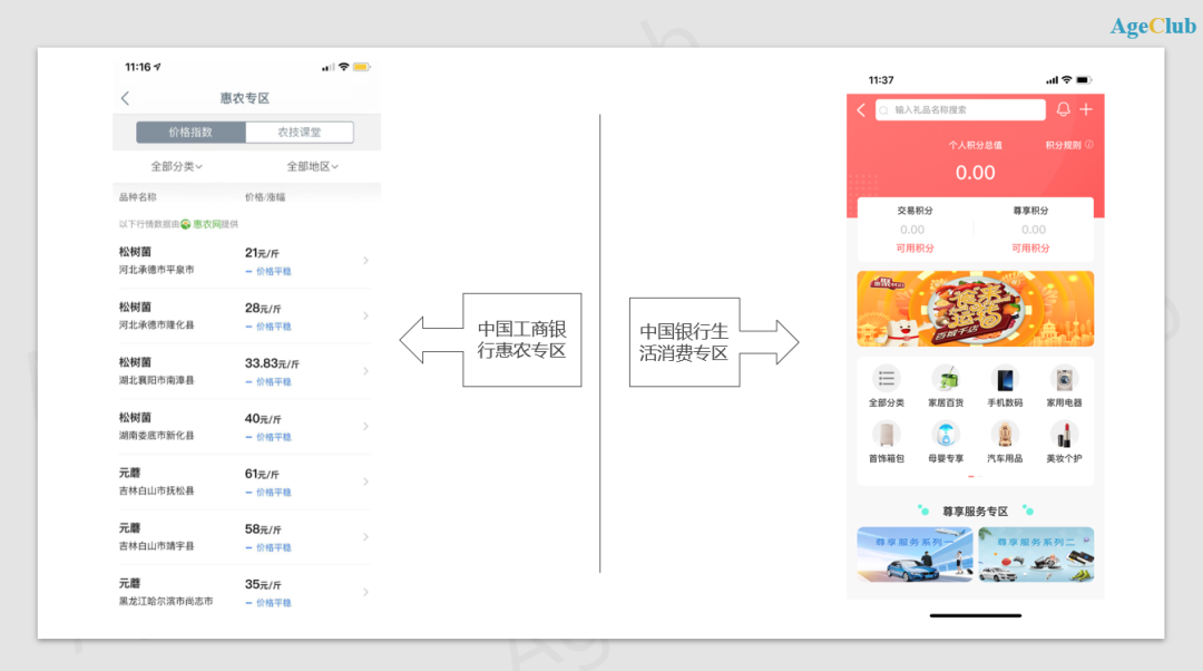 这种模式中,银行APP作为“流量”入口,链接不同的生活服务平台,为其 “输送”老年客群。不管是线下商超,还是线上电商平台、生活服务平台等,都有通过“银行”链接老年客群的机会。
