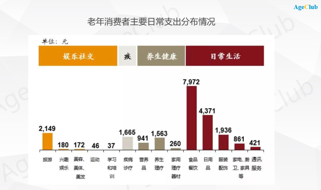 老年人的主要支出类目,某种程度上预示着“银发经济”的三大生意“切口”:生活消费(日常生活)、健康管理(养生健康)、以及老年旅游/学习(娱乐社交)。