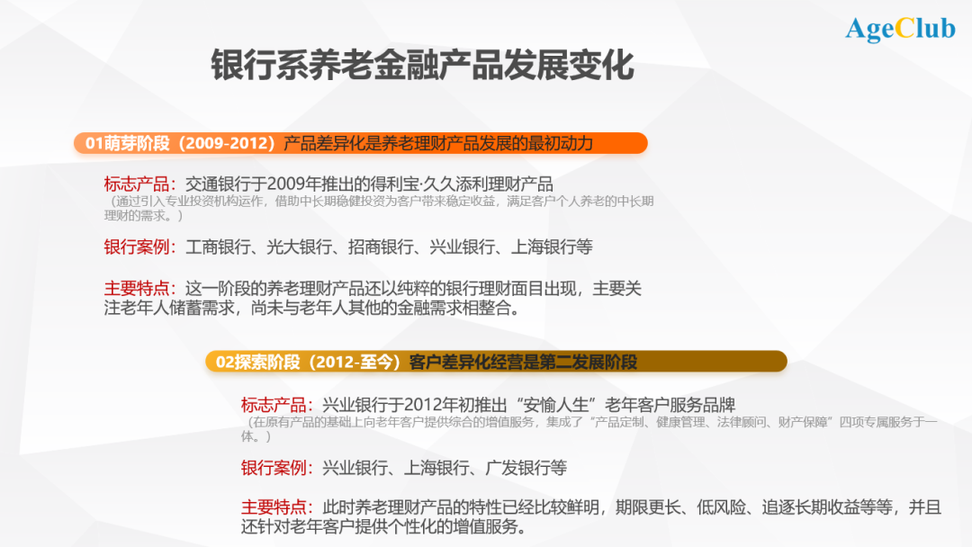基于老年客群需求,AgeClub梳理发现,过去十几年,银行系“养老金融服务”经历了从“产品差异化”到“客群差异化”的发展阶段:从“金融产品”到在原有产品基础上向老年客户提供综合的增值服务。