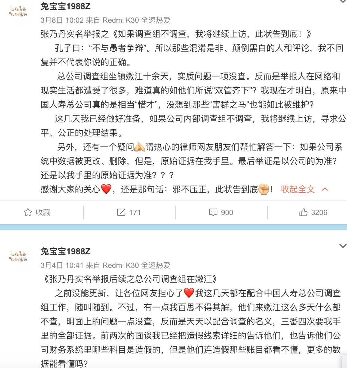 2月28日-3月8号,此前实名举报中国人寿的当事人张乃丹在个人微博上一直更新举报后续,但显然举报人对于调查结果并不满意。但据她表示,目前已与中国人寿总公司纪委调查组人员谈过话。但是,总公司调查组和以前来的调查组都一样,全程一点反应没有,他们只跟自己说查,但是没有任何动作,很敷衍。