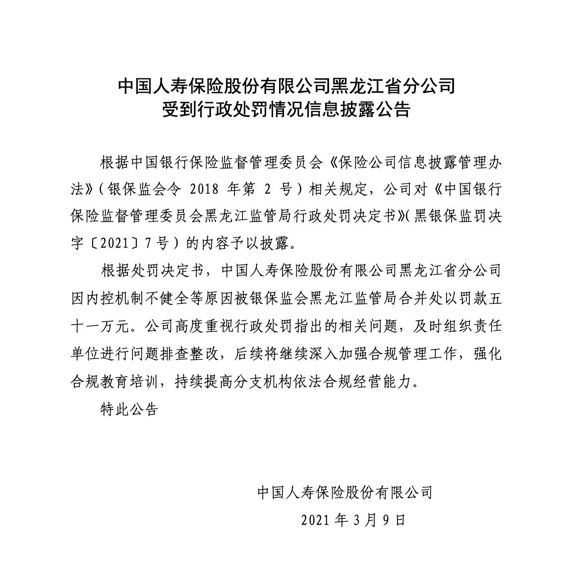 根据处罚决定书,中国人寿保险股份有限公司黑龙江省分公司因内控机制不健全等原因被银保监会黑龙江监管局合并处以罚款51万元。