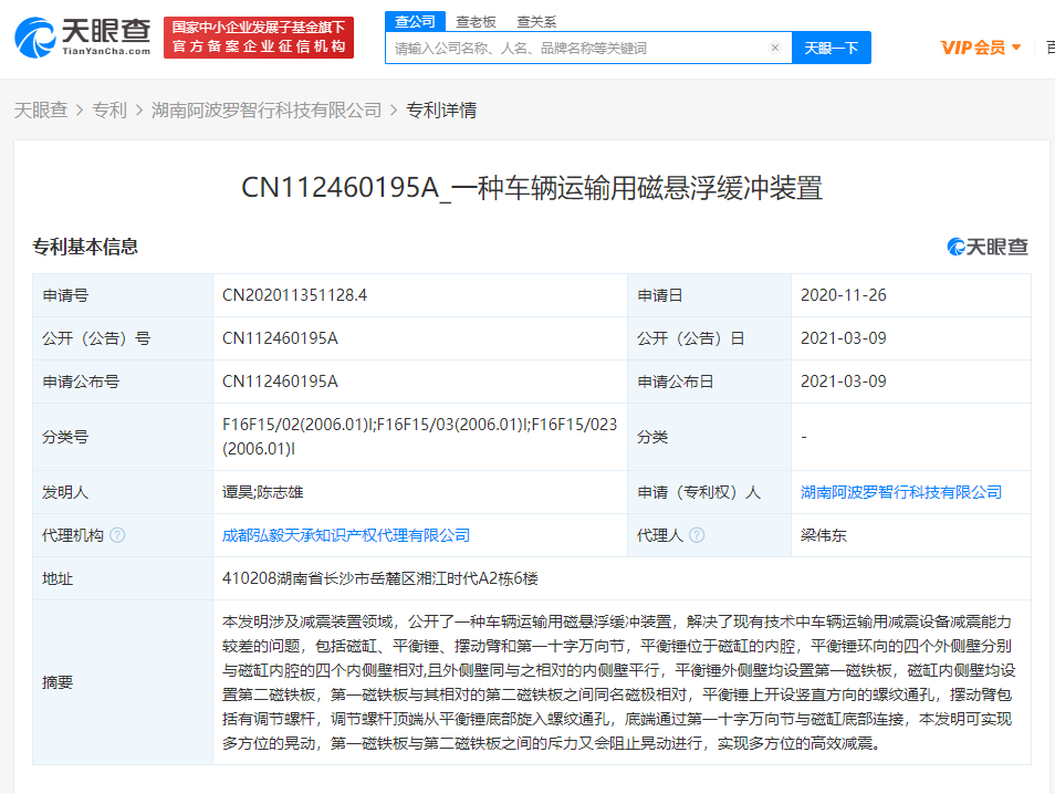 据天眼查APP显示,3月9日,湖南阿波罗智行科技有限公司公开一项名称为“一种车辆运输用磁悬浮缓冲装置”的专利,专利公开号为CN112460195A,申请日期为2020年11月26日。