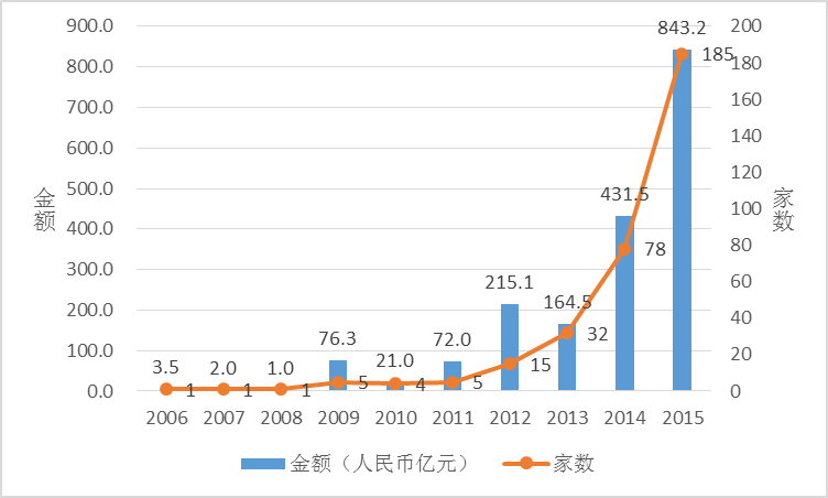 根据清科最新数据整理知2015年中国并购市场共完成交易2,692起,与上一年相比大增39.6%;其中2318起披露交易金额,合计1.04万亿元,同比增长44.0%。其中VC/PE参与的并购共计发生1,277起,较2014年上升31.4%;披露交易金额的有1,128起,金额总计5,893.39亿元,同比涨幅高达39.9%。从募资情况看,自2006年至2015年十年间,中国本土并购基金共有418支,其中327家披露募资金额,募资总额1829.92亿元。从新募集基金数与募资金额上看,我国并购基金都呈现高速增长态势,2015年就有185支新募资基金,创出并购基金成立家数的新高。具体成立家数与募集金额见下图。