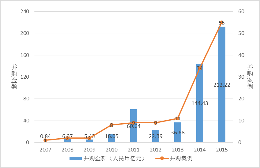 从投资案例数来看,2007年至2015年9年的时间中,并购基金主导完成131起并购投资,其中126起披露投资金额,金额总计达到504.07亿元。而2015年一年就完成投资案例55起,相比2014年增长61.8%,投资金额212.22亿元,同比增长46.9%。2007年至2015年具体并购金额与并购案例数见下图。