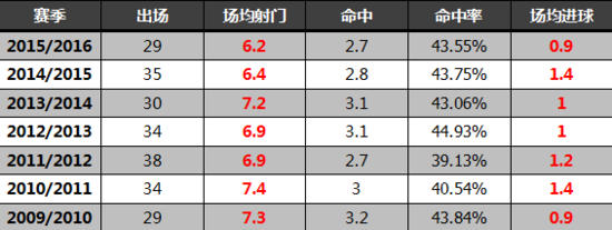 如果打开C罗在皇马的历史数据,你会发现,本赛季场均6.2次射门已经是最低的纪录了,同时命中率方面,也差不多是皇马生涯平均值左右,但是,在进球率方面,本赛季确实已经降到了C罗加盟皇马首个赛季的水平,在其余的5个赛季,有3个赛季进球总数不低于40,2个赛季在30-40之间。当然,本赛季还没有结束,C罗的进球总数也许赶不上上赛季的48个,但超过30应该不是难事,只是就目前的场均进球率来说,跟他以往相比,有些偏低。