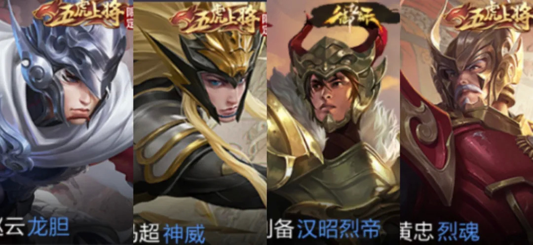 之后,《王者荣耀》推出的五虎上将皮肤中,不同英雄的皮肤之间也开始相互锚点,如赵云与马超的皮肤在战衣、武器、身姿、封面图上无限接近,而黄忠的皮肤封面几乎与刘备此前的皮肤为同一模子刻出。