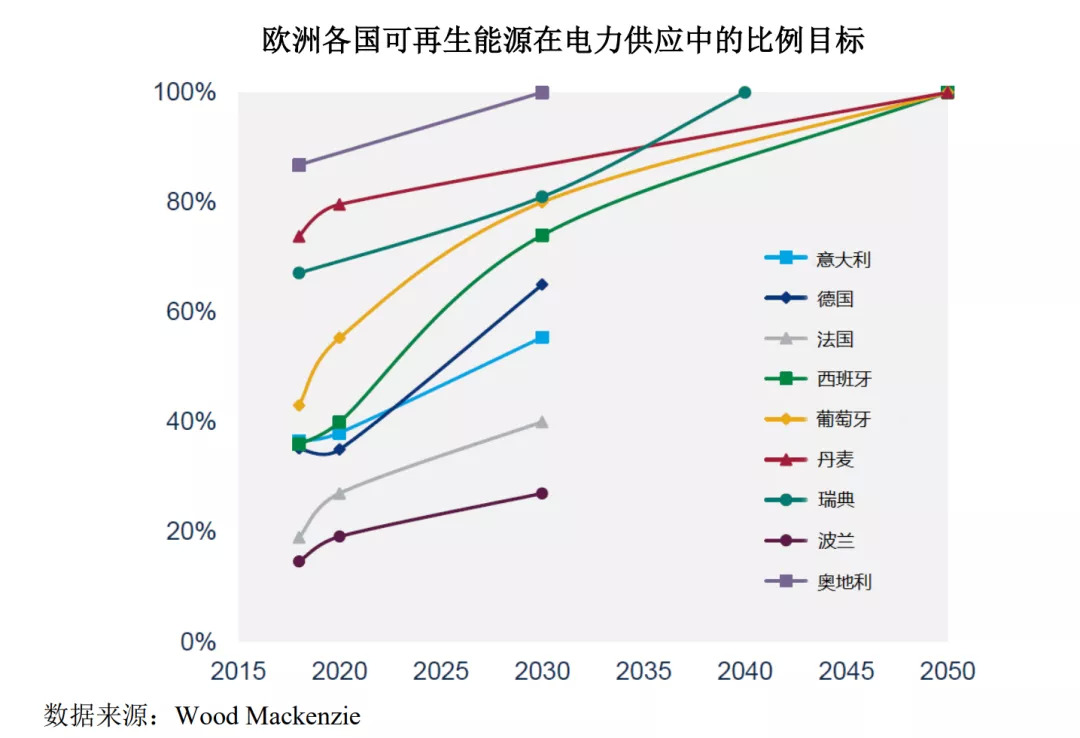 二是欧盟,欧盟委员会正式发布了《2030年气候目标计划》以及政策影响评估报告,提出将2030年温室气体减排目标从40%提高为55%,2030年可再生能源占能源消费比例需求将再提高;