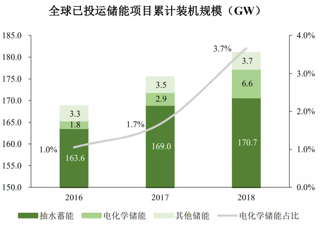 而电化学储能凭借建设周期短、应用范围广、成本持续降低等诸多优点,从2013年到2018年,在电力系统的新增装机规模由0.1GW增加至3.7GW,累计装机规模6.6GW,占比整体储能装机规模的份额极速上升。并且占比依然很小,方兴未艾,发展潜力极大。