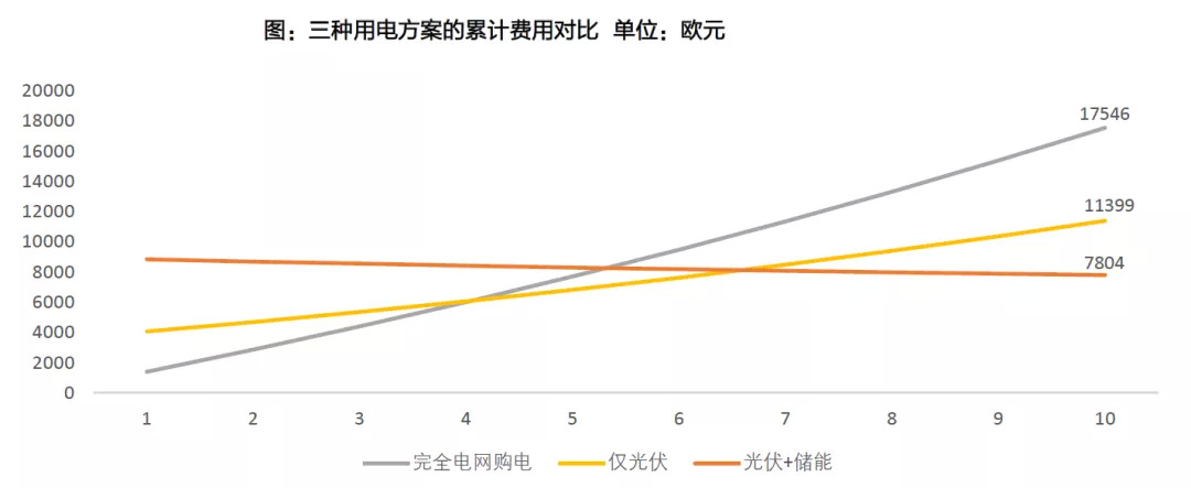 德国是高电费国家,也是光伏与储能系统走在最前列的国家,且他的政策要求了电池系统必须具有10年质保期。因而我们以德国为例,根据Solarpower EU的数据,德国家庭在30%补贴的情况下,十年的费用测算对比如下。