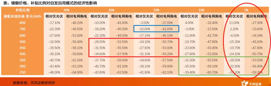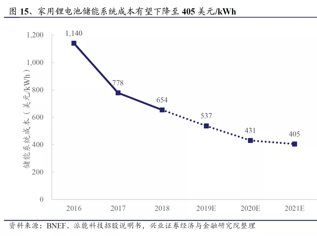 再看家用锂电储能的成本,已经从2016年的每kWh超过1000美元降到如今的400-500美元。结合上表,意味着未来即使没有补贴,“光伏+储能”的经济性依然有很强的吸引力,并且随着成本下降的刺激,吸引力会越来越显著。