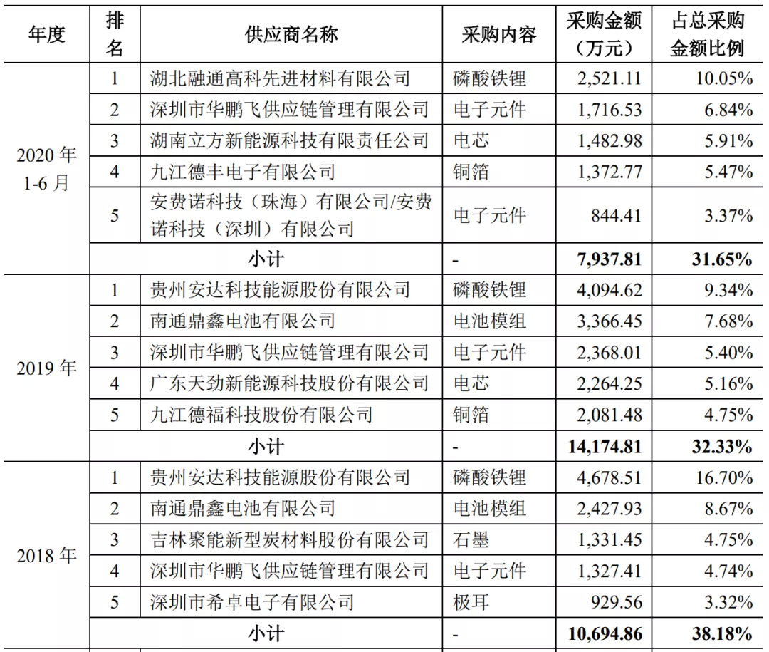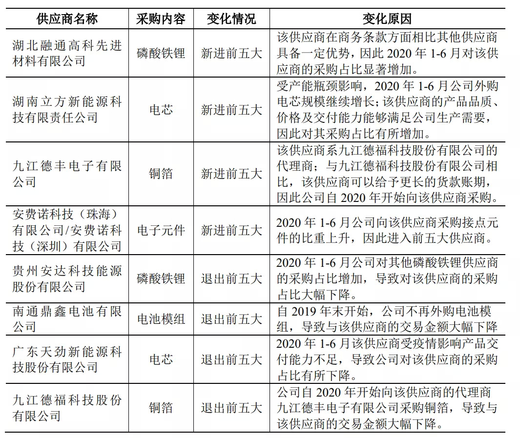 这也就意味着,派能采购的主要都是些基础的器件和材料,没什么技术壁垒,那他对上游的议价能力肯定是强的。我们截取2018-2020H1的前五大供应商来看也确实如此。