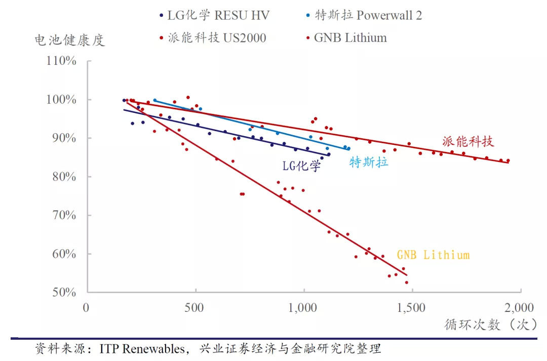 再看几家产品的循环寿命,派能的产品性能优势明显,在1500次使用后仍能具备90%寿命,与特斯拉和LG1000次使用后的健康度不相上下。