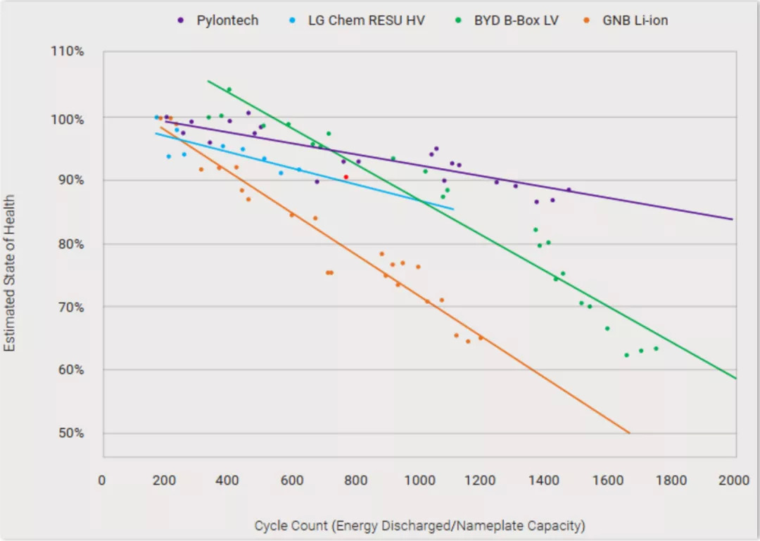 当然,磷酸铁锂路线肯定是比三元路线寿命长的,这样比或许意义不大。因此,我们找到同是磷酸铁锂电池的比亚迪,可以看到,绿线的比亚迪在循环使用1000次后,电池健康度开始急剧下降,无法与派能的稳定寿命抗衡。