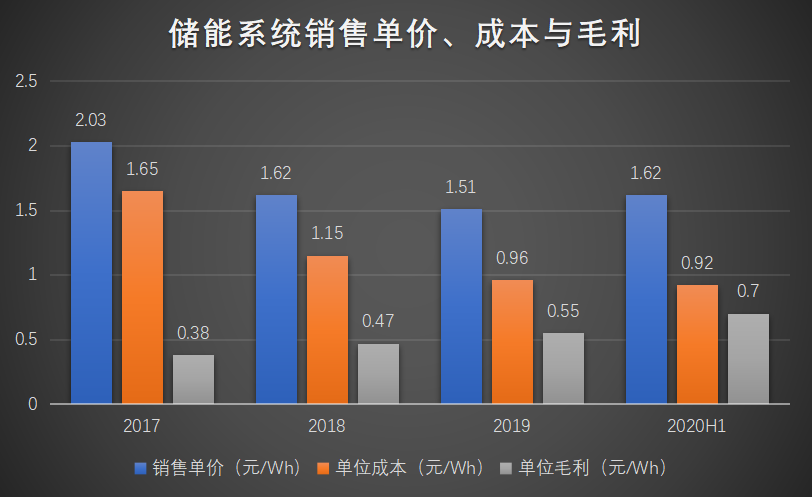 储能电池系统销售一直占据派能营收九成以上,是最主要的贡献者,我们只看此项即可。虽然2017-2020H1,公司储能电池系统销售单价从2.03元/Wh降至1.62元/Wh,但是依靠原材料价格下降、技术进步推动材料单位耗用量降低、自主品牌占比上升等,促使单位成本也从1.65元/Wh降至0.92元,从而使得单位毛利从0.38元/Wh上升到0.7元/Wh。