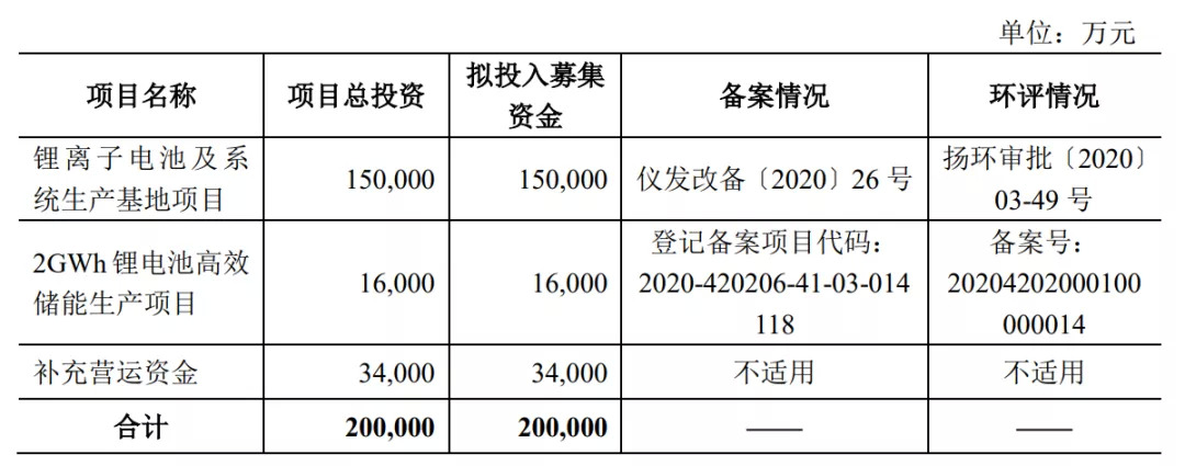 锂离子电池及系统生产基地项目的实施主体为发行人全资子公司扬州派能,项目总投资为150,000万元。本项目建成后形成年产4GWh电芯及3GWh系统的产能规模。
