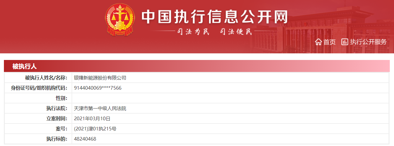 中国执行信息公开网消息,3月10日,银隆新能源股份有限公司新增一条被执行人信息,执行法院为天津市第一中级人民法院,案号(2021)津01执215号,执行标的48240468元。截至目前,银隆新能源股份有限公司累计被执行总金额超5000万。
