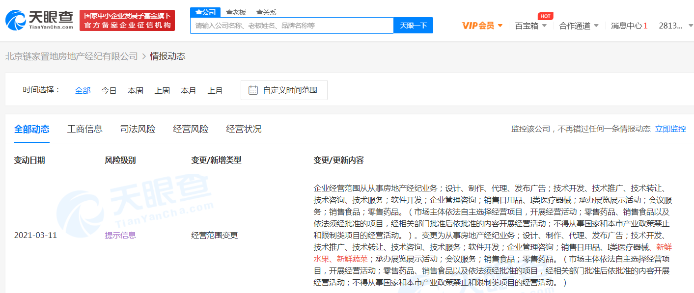 据天眼查APP显示,3月11日,北京链家置地房地产经纪有限公司发生工商变更,经营范围新增“新鲜水果、新鲜蔬菜”。