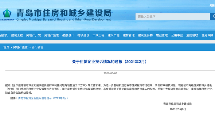 为进一步整顿和规范青岛市住房租赁市场秩序,降低群众租赁风险,近日,青岛市住房和城乡建设局发布最新的《关于租赁企业投诉情况的通报》,对2021年2月份区市两级住房和城乡建设(房管)部门受理的租赁企业投诉情况进行了通报。
