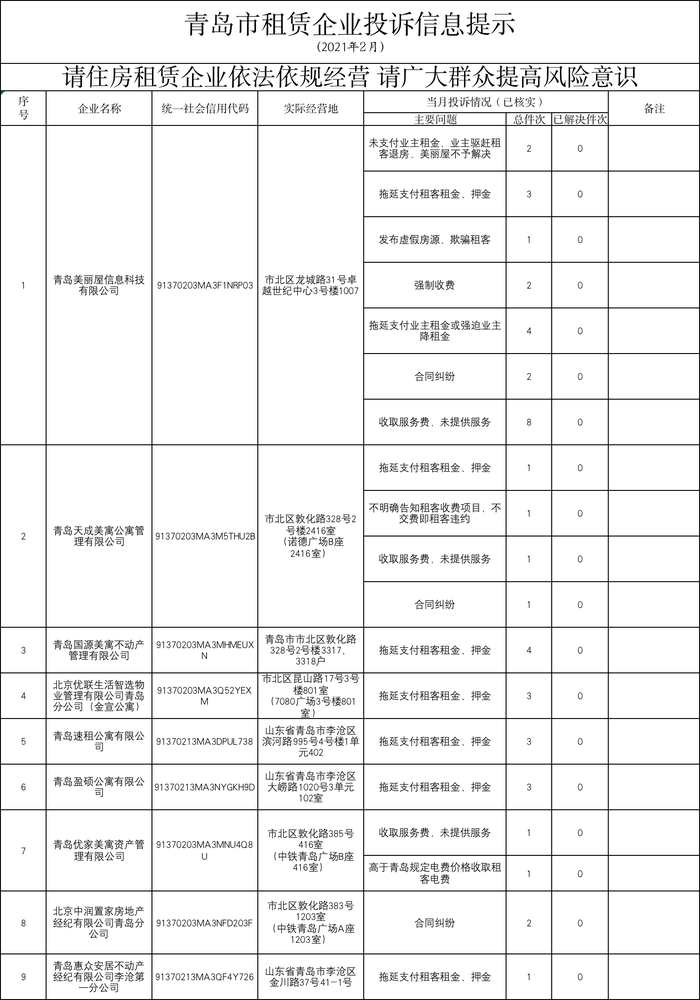 根据通报,今年2月份青岛全市共有9家住房租赁企业存在被投诉情况,分别为:青岛美丽屋信息科技有限公司、青岛天成美寓公寓管理有限公司、青岛国源美寓不动产管理有限公司、北京优联生活智选物业管理有限公司青岛分公司(金宣公寓)、青岛速租公寓有限公司、青岛盈硕公寓有限公司、青岛优家美寓资产管理有限公司、北京中润置家房地产经纪有限公司青岛分公司和青岛惠众安居不动产经纪有限公司李沧第一分公司。
