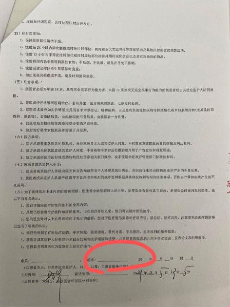 黄女士表示,在注射前,院方没有向自己出具任何关于胶原蛋白注射的风险提示和注意事项告知,自己完全不知道可能出现皮肤坏死,结痂,脱皮,感染以及形成浅表瘢痕等严重后果。如果事前有风险说明,她完全没必要尝试此高风险的美容方式,将严词拒绝注射胶原蛋白。