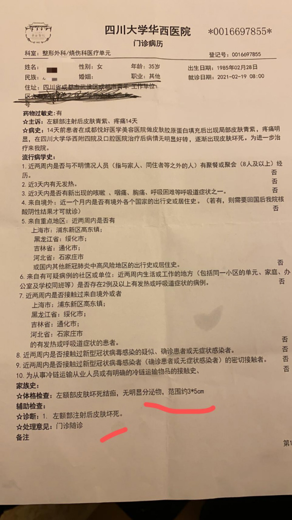 经过治疗,黄女士的病情没有明显好转,于是,黄女士又去往四川大学华西医院就诊,并被确诊为左额部注射后皮肤坏死,并疑似注射引起神经受损。