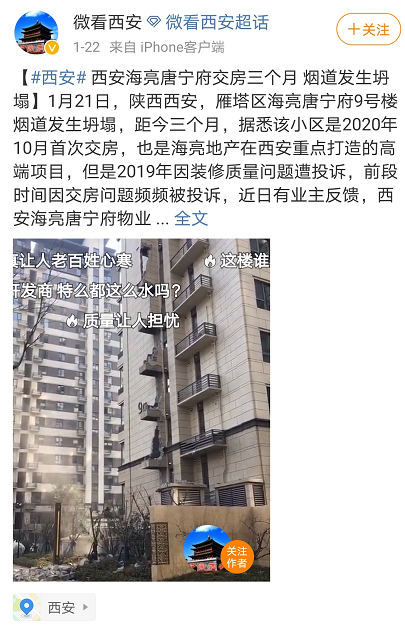 在高速发展的2015——2018年前后,楼市交易火爆,大量期房产品被售出,部分房企超高速运转而赶工期,让交付产品质量存在很大的隐患。比如房体断裂、楼层漏水、门窗松动、电梯故障等等,让购房者无法安心居住。而回看西安,1月份西安海亮唐宁府交房三个月,烟道发生坍塌事件还历历在目,所幸现场无人伤亡。