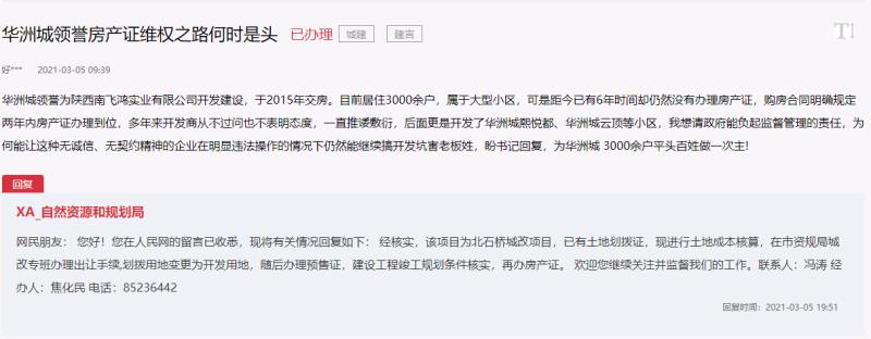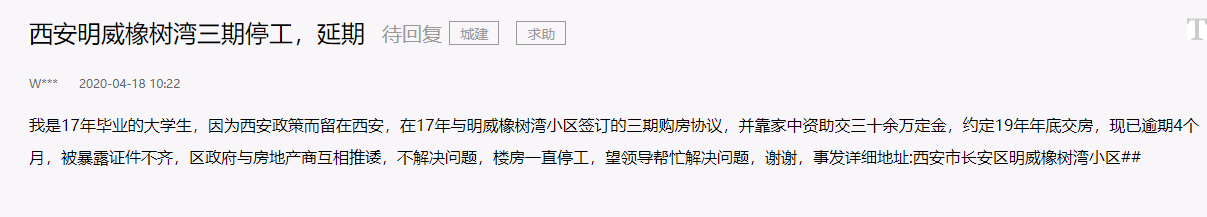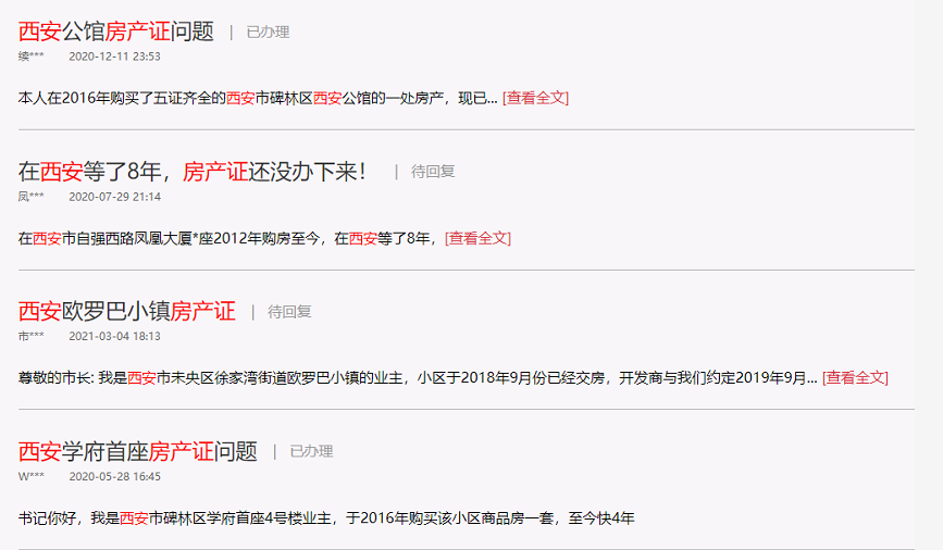 界面楼市西安频道从领导留言板上搜索“西安房产”,便出现了许多关于维权的信息,经粗略统计,2020年西安楼市维权就有约60余条留言。经过留言板资料整理分析可发现,房产维权主要集中在一下几个方面: