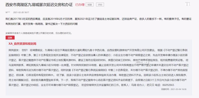 牵扯到土地相关的还有小区部分土地未供应,便各种验收无法办理,导致开发商办理不动产首次登记资料不齐全,以至房产证迟迟办理不下来。比如西安市高陵九境城,目前该小区所占土地进入报批程序,按照取得房产证的流程,该时间预计或仍较长。