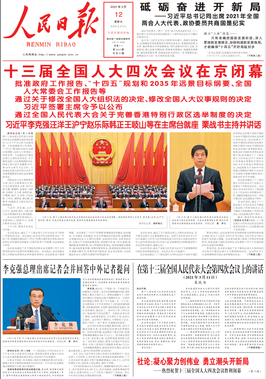 今天《人民日报》的主要内容有: 1、第十三届全国人民代表大会第四次会议在圆满完成各项议程后,11日下午在人民大会堂闭幕。大会批准政府工作报告、“十四五”规划和2035年远景目标纲要、全国人大常委会工作报告等。大会通过关于修改全国人大组织法的决定、关于修改全国人大议事规则的决定,国家主席习近平签署第73号、第74号主席令予以公布。大会通过全国人民代表大会关于完善香港特别行政区选举制度的决定。 2、十三届全国人大四次会议11日下午在人民大会堂举行记者会,国务院总理李克强应大会发言人张业遂的邀请出席记者会,并回答中外记者提问。 3、十三届全国人大四次会议主席团常务主席第三次会议11日上午在人民大会堂举行。大会主席团常务主席、全国人大常委会委员长栗战书主持会议。 4、杨洁篪、王毅将同美方举行中美高层战略对话。 5、王毅分别同奥地利外长和瑞士联邦副主席兼外长通电话。 6、外交部发言人赵立坚11日就美国国务卿布林肯有关表态答记者问。 7、人民时评:把药品集中带量采购这件实事办好。 8、中菲联合举办研讨会纪念中国—东盟建立对话关系30周年。 9、南非力促汽车业复苏。 10、世界知识产权组织近日发布报告称,2020年通过该组织提交的国际专利申请量继续增长,中国的国际专利申请量位居第一。