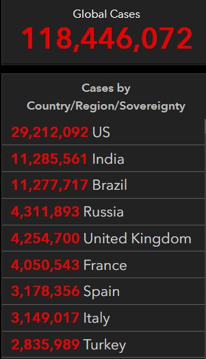 据约翰斯·霍普金斯大学的疫情追踪数据,截至北京时间3月12日上午8点,全球累计确诊新冠肺炎病例118446072例,累计死亡2628279例。