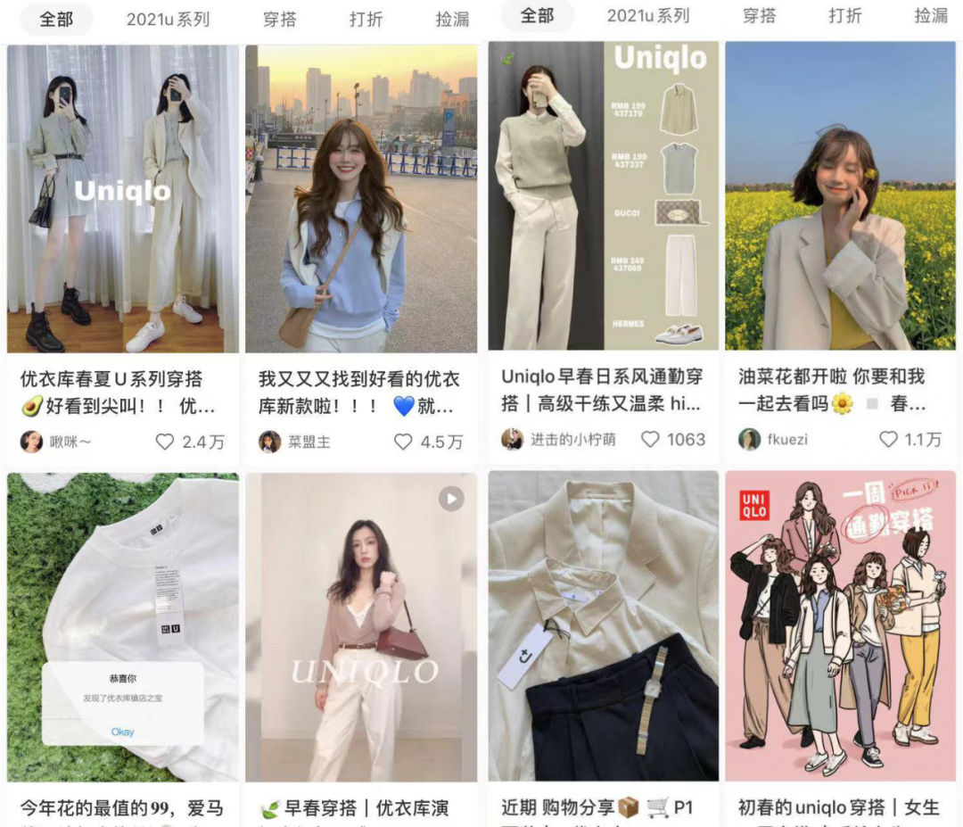 以“优衣库”为关键词在小红书上检索,会得到各种或自发的或品牌赞助的穿搭报告,以及种草分享,这种“全民种草”就直观表现为爆款的流行——今年的优衣库摇粒绒外套约等于“平民的貂”/“全民校服”。