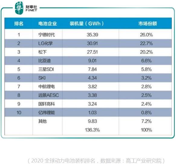 以2020全球动力电池装机情况来看,宁德时代占全球份额为26%,LG化学则为22.7%。