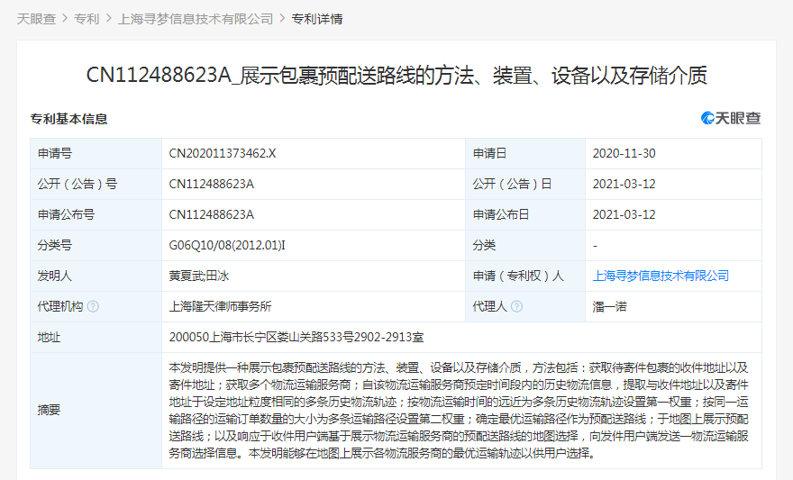 据天眼查APP显示,3月12日,拼多多关联公司上海寻梦信息技术有限公司公开一项“展示包裹预配送路线的方法、装置、设备以及存储介质”专利,公开号为CN112488623A,申请日为2020年11月。