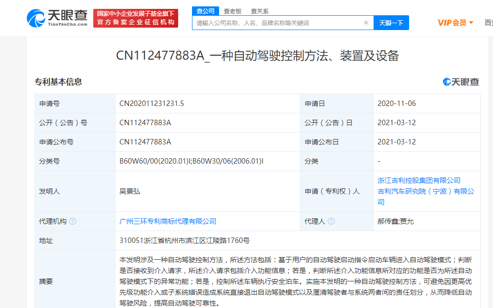据天眼查APP显示,3月12日,浙江吉利控股集团有限公司公开一项名为“一种自动驾驶控制方法、装置及设备”发明专利,公开号CN112477883A,申请日期为2020年11月。