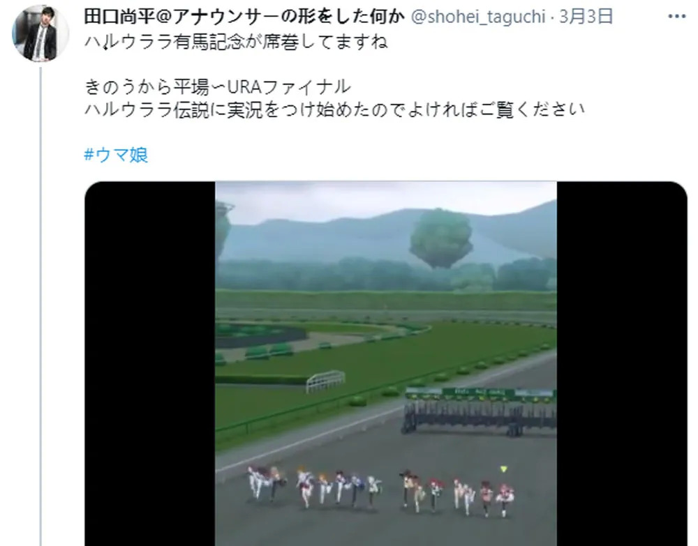 听了游戏的赛马比赛解说,东京电视台体育播音员田口尚平都忍不住在游戏内的赛场做起“本职工作”。