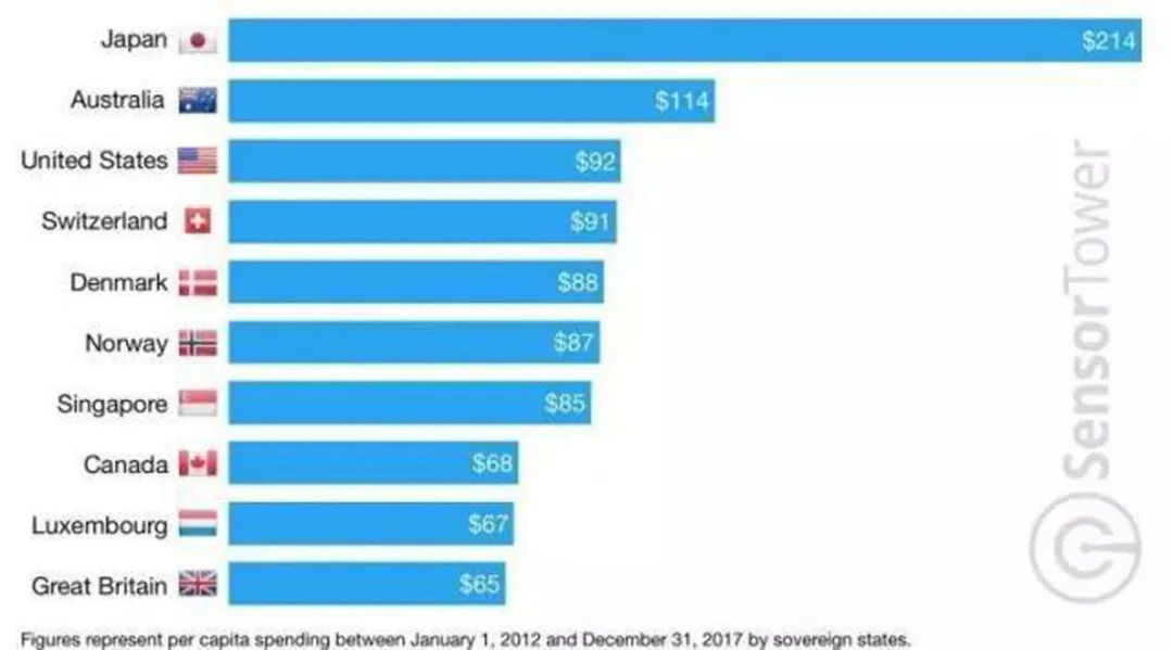 SensorTower曾公布的12年1月至17年12月各国人均手游氪金排行榜