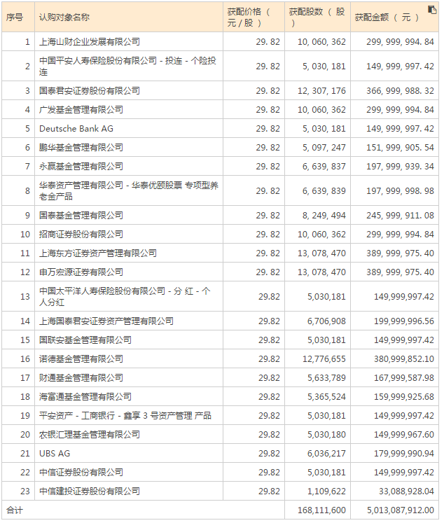 其中,山东财政厅控股的上海山财企业发展有限公司获配金额为3亿元,东方证券、申万宏源均认购了3.9亿元发行股票,诺德基金的获配金额是3.81亿元,国泰君安证券以3.67亿元认购发行股票,广发基金、招商证券等认购了近3亿元发行股票,UBS AG(瑞银集团)、Deutsche Bank AG(德意志银行)等外资也参与此次认购。
