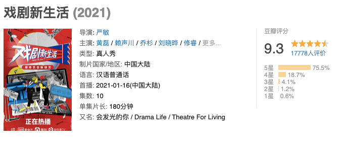 播出7期,豆瓣评分9.3,拉来黄磊、严敏等知名综艺人坐镇,《戏剧新生活》的品质有目共睹。虽然节目热度和出圈还有一定的距离,但从数娱梦工厂采访的行业人士来看,这档综艺还是获得了戏剧爱好者的广泛认可。